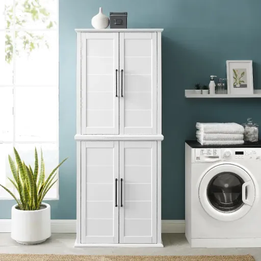 Add a little farmhouse shiplap to your space with the Bartlett tall storage pantry is an on-trend take on home organization. Comprised of two identical stackable pantries, this set is connected with a sturdy metal plate, offering ample storage without taking up valuable floor space. Each cabinet features adjustable shelves that will accommodate dishes, linens, office supplies, and more. With stylish oversized hardware, the Bartlett pantry adds polish to your kitchen, laundry or any room where you need additional storage. Available for Online Purchase Only. Ships Directly from the Manufacturer. RC Willey Delivery is Not Available. Assembly required.