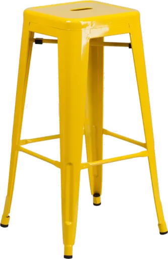 This yellow metal bar stool, available from RC Willey, adds a modern, industrial appearance to your home or work space. This space-saving stool is stackable, making it great for storing. A cross brace underneath the seat adds extra stability and features plastic caps that prevent the finish from scratching when stacked. The legs have protective rubber feet that prevent damage to flooring. This all-weather-use stool is great for indoor and outdoor settings. For longevity, care should be taken to protect from long periods of wet weather. The unique design of this backless stool can conform to many spaces. Available for Online Purchase Only. Assembly required. This product ships direct from the manufacturer, so RC Willey Delivery is not available. This product is rated for Business or Commercial use.