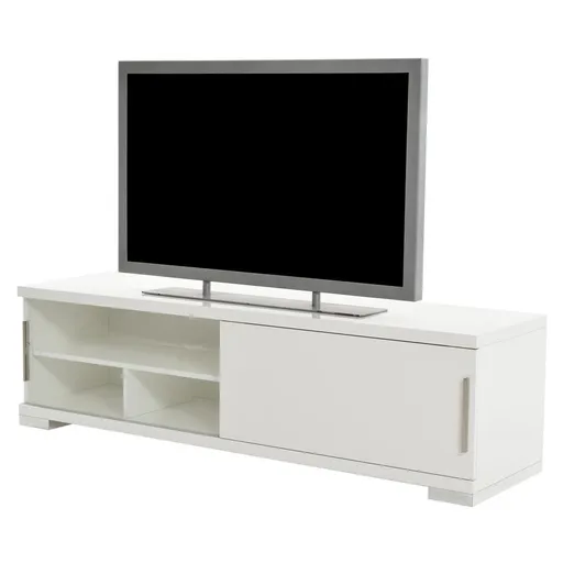 The Asti TV Stand's Italian design is reflected in its simple and sleek design. In its white finish, this piece will stand out anywhere you place it. Made from Zebra wood, finished in high glossy white, featuring glass and wood sliding doors, metal handles and feet.