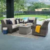 The Tangiers Collection is a modern take on traditional wicker with handwoven synthetic wicker and triple layered foam cushion that will give your outdoor space the sophistication it deserves without sacrificing comfort. Each seating piece of this 4 piece swivel sofa group with a fire pit is handwoven with 11mm x 2.3mm half-round synthetic wicker strands, treated with UV inhibitors, over a powder-coated extruded aluminum frame. The wicker material is crafted with a 3000 hour UV rating to provide fade-resistance. The sofa and swivel glider club chairs have architectural features such as curved arms and a bottom seating frame with an inward curved arch. Sink into the triple-layer foam construction cushions wrapped in 100% Sunbrella® acrylic fabric and relax in comfort with this generously sized collection.