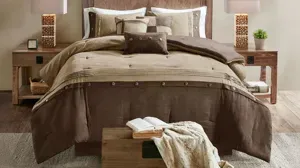 For a warm, lodge look in your space, the Boone queen 7-pc. comforter set is perfect for you. The unique fabric used in this set has a textured earthy print pieced with polyester microsuede at the bottom and buttons for a personal touch. Three Decorative pillows using piecing and embroidery of both top of bed fabrics completing this cohesive look.