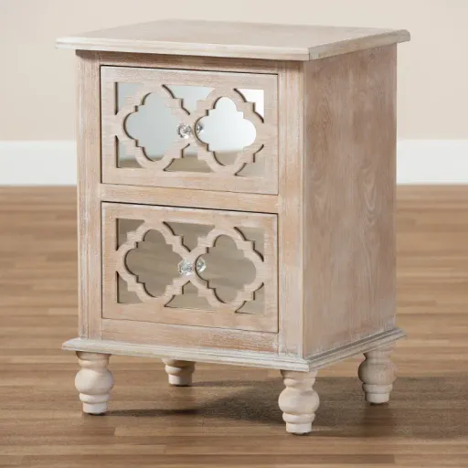 Offering a unique mix of rustic and glam, the Edith nightstand promises to be a chic bedside companion and RC Willey has it! This wood nightstand displays a white-washed oak finish for an aged, vintage look. Two drawers provide ample space to store all the bedroom essentials. Mirrored glass adds a hint of glamour and highlights the elegant quatrefoil pattern layover. Crystal knobs and turned feet add an extra dose of charm. Available for Online Purchase Only. Assembly required. This product ships direct from the manufacturer, so RC Willey Delivery is not available.