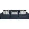 Elise 3 Piece Sectional from Fusion Furniture. Includes LAF chair, Armless chair and RAF chair. Frame constructed of hardwoods and furniture grade plywood. Quality foam cushion core construction. Covered in a navy ink colored polyester fabric. Includes 2 accent pillows in Mundo Mystic, 2 accent pillows in Newton Spray and 1 kidney pillow in Karoo Mystic, not sold separately. Spot clean with water-free solvents, cc WS.