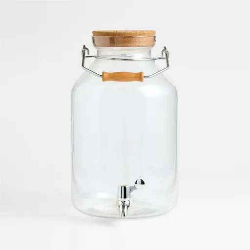 Large-capacity 3-gallon beverage dispenser pours on the fun at casual cocktail parties, family reunions and outdoor occasions. Clear acrylic container with Mason jar shape is topped with a cork lid and gets a lift from its metal and wood handle. Low-lying spout ensures easy and long-lasting pouring.
