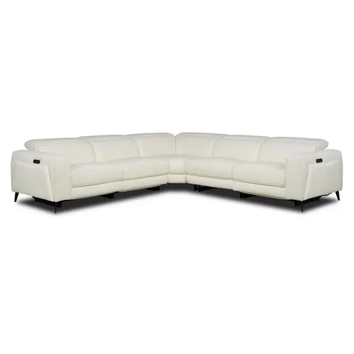 Whether you're entertaining for Game Night or lounging with the family on a Friday night, you can't beat the style and comfort of the Luke 2.0 White Leather Power Reclining Sectional with 5PCS/3PWR. Made with 100 percent top grain leather where the body touches, this beautiful, modern sofa features sleek track arms, angled metal legs, welt trim and contrast stitching.
