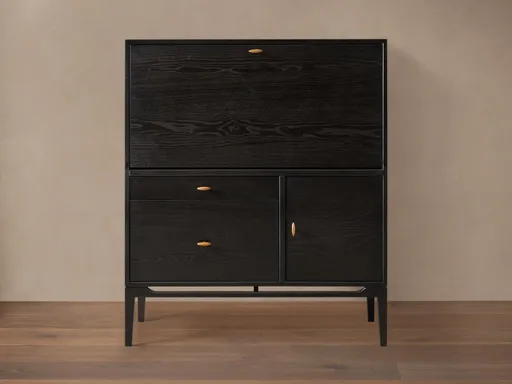A modern classic, our Brock Hideaway Desk’s understated aesthetic features elegant lines, a deep, hand-stained finish, and a flip-down door that opens to reveal a spacious workspace. Brock’s leather writing surface and subtle, burnished brass hardware elevate its midcentury style, complementing natural ash wood with sophisticated detailing.