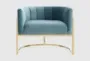 The Deanna accent chair is a contemporary, sea blue velvet chair with a stainless steel gold frame, perfect for indoor use in the living room, dining room, den, library or study. This curved chair features track arms, foam cushions, a tight back, and channel tufting, and is available in multiple color options with a fabric swatch available for your convenience.