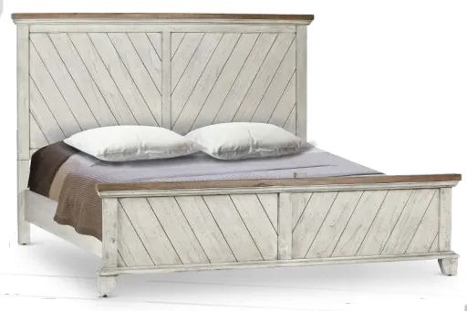 Add inviting farmhouse charm to your bedroom space with the rustic-inspired design of the Bear Creek collection. Sturdily crafted, this queen size bed features a white-smoke finish with contrasting honey-smoke stained tops. Both the headboard and footboard offer an eye-catching chevron pattern.