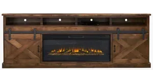 The Farmhouse 94" Fireplace Console highlights the rustic rolling barn style doors and metal accents that are now a staple in many homes across America. Reminiscent of simpler times, the farmhouse appeal is understandable and undeniable. This console holds up to a 107" TV and has plenty of room to show off your media gear and collectibles to impress all who visit. The house warming 42" fireplace insert has clear crystals and traditional log set with embers to keep you toasty while binge watching your favorite TV show or movie.