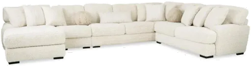 Set an irresistible backdrop in your gathering spaces with the lounge-ready and oh-so-soft Hendrix collection! Generously scaled, the 4-piece sectional is covered in a plush fabric, featuring a breezy and versatile ivory color with horizontal channeling. Supportive cushions with a sink-right-in feel and a spacious, roomy design make unwinding hard to resist. Includes right-facing loveseat, right-facing bumper sofa, armless chair, and left-facing chaise.
