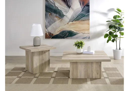 Striking in form and rich in texture, this two-piece table set blends sculptural presence with rustic character. A square cocktail table and matching end table feature thick tops resting on bold plinth-style bases, creating clean geometric silhouettes. Finished in distressed pine, each piece showcases natural wood grain across engineered construction with a durable melamine veneerperfect for anchoring a warm, grounded living space.