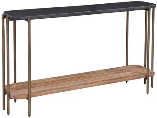 The Adrienne console table features a modern influenced design in warm moody color palette with a sandblasted black marble top and solid mango bottom shelf in a natural finish with v-grooves for planked effect. The iron table frame is in an antique brass finish.