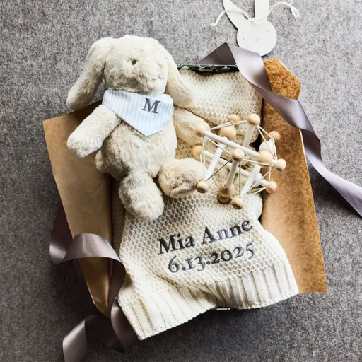 This thoughtful bundle makes a heartwarming gift for the littlest snuggler. Our supersoft ivory stroller blanket offers cozy comfort with its bubble-knit texture, while a soft bunny stuffie brings cuddly companionship. Made from natural wood, the Manhattan Skwish multi-sensory rattle adds a playful touch that promotes curiosity and motor skill development. Together, these pieces create a gift set that celebrates a baby with warmth, softness and simple joy.