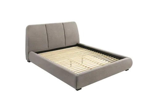 Softly sculpted and thoughtfully tailored, this upholstered platform bed brings a quiet elegance to modern sleep spaces. Its curved silhouette flows from a gently flared headboard to rounded side rails, offering a sense of movement and ease. Three stitched panels add subtle dimension, while the built-in slat system provides durable mattress support without the need for a foundation. Crafted from solid and engineered wood, it balances sculptural form with everyday comfort.