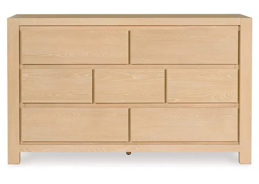 Love casual design with a modern flair? We've got you covered with the striking Whittgate dresser. Its light natural finish enhances the beautiful wood grain character with a relaxed vibe. Sleek, hardware-free drawers offer storage spots with a contemporary edge, bringing a fresh style awakening to your bedroom.