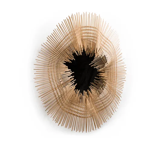Like the rays of the sun, the Twiggy mirror is made of fine lines beaming from its center. Rattan spokes are woven over a steel frame, creating a radial pattern with gentle slopes. Material rattan, powder-coated steel, mirror glass Dimension 110 cm x 110 cm x 18 cm