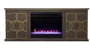 Give your home a stylish upgrade with this Purley fireplace console. Gold inlay design adds modern appeal, while push-to-open doors discreetly store your games and movies. Color changing flames, sophisticated faux crystal fill, and remote-controlled features bring stylish comfort to your family room or den, working with or without heat for enjoyment in all seasons. Cozy up to family movie night with this freestanding media fireplace console in your living space or game room.