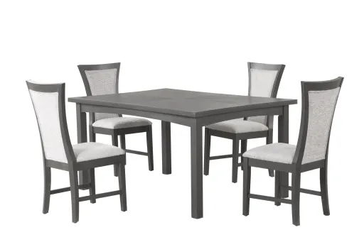 This dining set will add a stylish and functional addition to any dining space. Crafted with a mix of Acacia and Rubberwood solids and veneers, this collection offers both durability and aesthetic appeal. The Gray Finish adds an elegant touch, making it suitable for various interior styles. The 100% Polyester Fabric Seats provide comfort and easy maintenance. Whether you're hosting a dinner party or enjoying a family meal, this dining collection ensures a cozy and visually appealing dining experience. Upgrade your dining area with this sophisticated collection and transform your space into a haven of elegance and comfort.