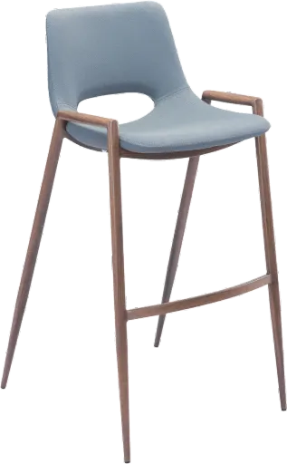 The Desi gray bar stool has mid-century modern urban lines and looks great in any space. With a heavy-duty vinyl covering and a sturdy steel frame, this bar stool fits in any home kitchen, dining area, or bar. The legs are finished in a durable walnut veneer coating. Available for Online Purchase Only. This product ships direct from the manufacturer, so RC Willey Delivery is not available.
