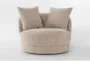 The Avaya Beige Fabric Wicker Swivel Barrel Chair is a stylish addition to any living room. Its modern design features a round shape and a comfortable, loose reversible back. The chair is armless, allowing for a more open and inviting seating experience.