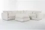 Introducing the Ruby Cream Beige Natural Boucle Fabric 127" 5 Piece Modular L-Shaped Sectional With Ottoman. This casual, symmetrical sectional is designed to bring comfort and style to your living room. Upholstered in soft, cream-colored fabric, it offers a cloud-like seating experience with its plush cushions and curved design.