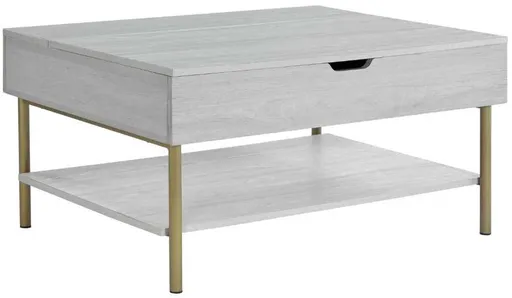 Mid-Century Modern elegance in a Lift-Top Table that offers a great look at a great value! White veneered tops and sides give the look and feel of solid wood. Champagne finished tubular metal legs add a mixed media touch for a centerpiece that turns any room into an office or dining area.
