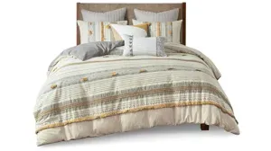 The Cody full/queen 3-pc. comforter set brings a smart combination of texture and style to your bedroom. This 100% cotton comforter features a gray and yellow striped print with pompom and trim details for a casual, yet sophisticated look. Hidden bar tacks, on top of the comforter, create a clean, duvet-like finish and the solid gray reverse complements the bold design. Matching shams with overlap openings, on the back, coordinate perfectly with the comforter to complete this casual bedding set. This comforter set is also OEKO-TEX certified, meaning it does not contain any harmful substances or chemicals to ensure quality comfort and wellness.