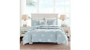 Harbor House Seaside creates a calm coastal look in your bedroom. The embroidered starfish and seashell motifs on a cool dusty blue background enhances the coastal look for a casual update. The square decorative pillow features embroidered coral. The bedding set includes 1 quilt, 2 shams, and 1 decorative pillow.