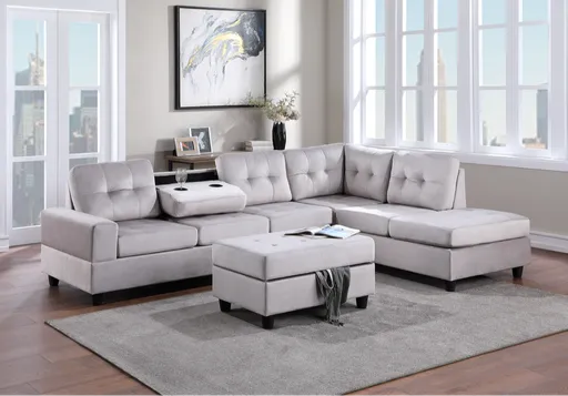 21HEIGHTS REVERSIBLE SECTIONAL STORAGE OTTOMAN - SILVER Item Number 21Heights Material Velvet Color Silver Description Reversible Sectional and Storage Ottoman Set Sold as Set Only . Sleek, simple, and modern. This sectional covered in silver velvet fabric features a drop down cup holders table and a storage ottoman. Dimension RAF SOFA 78L x 34D x 34H LAF CHAISE 80L x 34D x 34H Storage Ottoman