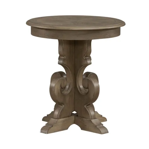 Elevate your living space with the Magnolia Manor round end table. Meticulously crafted using Poplar solids with Quartered and Split Heart White Oak veneers, this piece features a Weathered Bisque finish. The focal point of the table is its luxurious fancy face veneer top, showcasing a captivating array of wood grain patterns. This top not only elevates the visual appeal but also introduces an element of richness to your decor, creating a perfect surface for displaying cherished items or providing a convenient spot for your favorite beverage. The scrolled pedestal base serves as a distinctive feature, adding a touch of elegance and character to the table's design. With its gracefully curving lines, the pedestal exudes a sense of movement and style. Shaped bracket feet provide a solid foundation, ensuring stability and durability while enhancing the overall aesthetic. Immerse yourself in the seamless blend of design and practicality with the Magnolia Manor round end table.