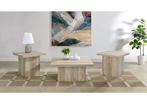 Striking in form and rich in texture, this two-piece table set blends sculptural presence with rustic character. A square cocktail table and matching end table feature thick tops resting on bold plinth-style bases, creating clean geometric silhouettes. Finished in distressed pine, each piece showcases natural wood grain across engineered construction with a durable melamine veneerperfect for anchoring a warm, grounded living space.