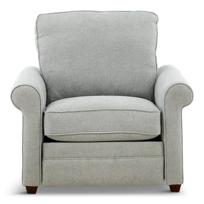 The Chaplin power recliner is a large overstuffed chair that sits like a dream. With classic rolled arms, feather down pillows, deep seats & solid wood legs, it's covered in a versatile neutral colored linen style fabric. A beautiful transitional look perfect for creating your own personal oasis.