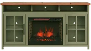 Your Vineyard Fireplace Console is dressed in an alluring, two-toned Sage Green with Fruitwood top, to create a refreshing, new look to any room. Holds up to an 85" TV with plenty of room to store your media gear, while showing off your personal touch. The housewarming 28" Fireplace Insert has clear crystals and traditional log set with embers to keep you toasty while binge watching your favorite TV show or movie. Sit back, relax and love your transformed home.