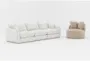 Introducing the Ruby Cream Beige Boucle Fabric Modular 3 Piece Sofa and Avaya Beige Fabric Wicker Swivel Barrel Chair. This casual living room set combines comfort and versatility, featuring soft polyester fabric in a soothing cream color. Perfect for any family or great room, the modular design allows for easy rearrangement to suit your needs.
