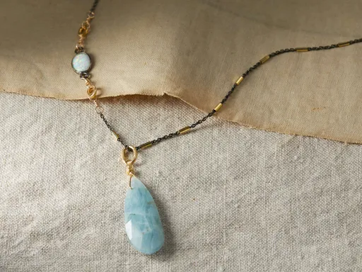 Our beautiful Devyn Necklace is crafted to channel the calming and healing properties of natural aquamarine. Offset with a magical Australian opal and accented by 22 kt gold vermeil details, this statement necklace is an exquisite addition to any wardrobe.