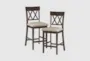 Enhance your dining or kitchen area with the Floyd Brown Wood Double X Back 25.5" Counter Height Stool Set Of 2. These farmhouse-style stools feature a dark brown finish and a comfortable design, making them perfect for any countertop or high table. The double X back design adds a touch of rustic charm while providing sturdy support.