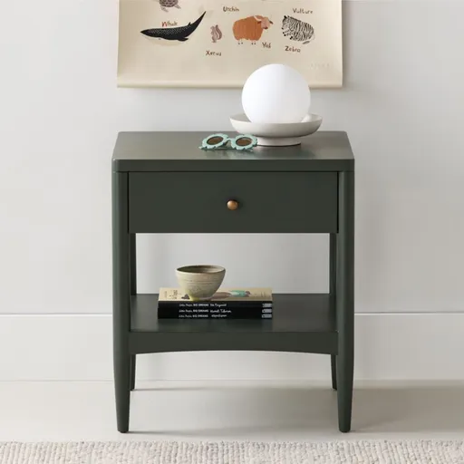 Give your kid's bed the perfect sidekick with the clean, timeless design of our Hampshire Olive Nightstand. The simple design means it'll fit in effortlessly, regardless of what kind of décor is in your kid's room. It features an olive finish that will never go out of style, plus a roomy drawer and a bottom shelf. The nightstand coordinates with our Hampshire beds.