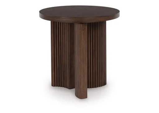 The Korestone end table exemplifies casual contemporary design with an urban vibe. Its rich brown finish is warm and inviting, and decor looks that much sleeker when displayed on the thick tabletop. A trend-right reeded base subtly nods to mid-century modern design. What a stunning reflection of your simple-meets-elegant sensibility.
