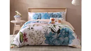Maia 5-piece reversible comforter set. On top of a white ground, blue, blush, pink and terracotta flowers look fresh on a high quality 230 thread count 100% cotton sateen. The reverse side picks up the terracotta color with dozens and dozens of subtle roses for two very versatile looks. The set includes 1 reversible comforter, 2 zipper shams and 2 decorative pillows. One pillow is embroidered, while the other is printed.