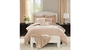 Chic and sumptuous, Romance king 9-piece comforter set brings luxurious sophistication to your bedroom. With the elegant rose quartz, taupe and accents of ivory, this exquisite bedding features a chenille poly jacquard comforter and matching shams with a modern all-over ogee design. The set includes Euro shams with embroidered border, standard shams, and three Decorative pillows that feature embroidery and faux fur texture details. The comforter comes with a removable insert and decorative buttons for a secured fasten.