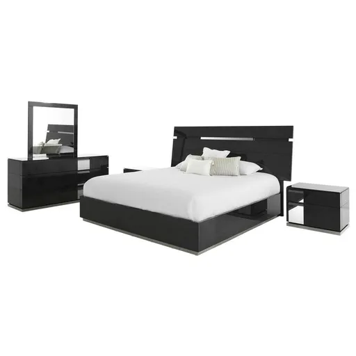 Upgrade your modern layout with the Italian design of the Heritage II 5-piece Queen Bedroom Set. This stunning collection is made with dark gray birch wood and features mirrored glass inserts, a polished metal base, and a smooth glossy finish. The stylish bed frame can help you set the lighting mood with the LED setting on the back of the headboard. Three drawers in the dresser can accommodate your clothes, while the two compartments in the nightstands can store your books, alarm clocks, and bedtime essentials. The classic straight-edge mirror can help you get ready for your daytime routine and nightly escapades.