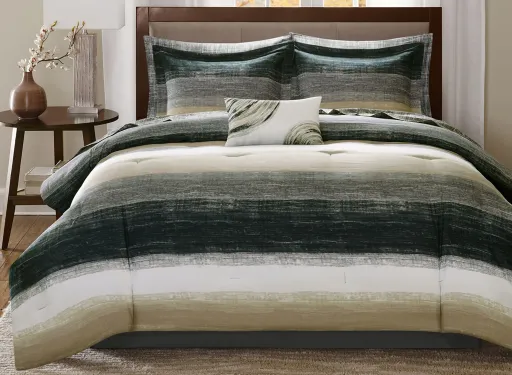 The Madison Park Essentials Saben Complete Comforter and Cotton Sheet Set provides a modern update to your bedroom. A watercolor stripe print is beautifully displayed on the ultra-soft microfiber comforter. The matching shams (1 in Twin Sizes) mirror the pattern of the comforter, while an embroidered decorative pillow and a solid grey bed skirt to complete the bedding set. A coordinating textured grey cotton sheet set is also included to complement the casual style of the comforter. Bringing the best in health and wellness, this bedding set also features an anti-microbial treatment that provides built-in freshness protection, reducing the growth of odor causing bacteria and keeps fabric lasting longer. This bedding set is also OEKO-TEX certified, meaning it does not contain any harmful substances or chemicals, ensuring quality comfort and wellness.