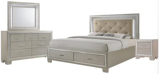 The Platinum king platform storage bedroom set glams up your bedroom. Its chic champagne finish is accented by a decorative mirror trim throughout. Stylish, chrome nail heads and faux leather are used in its high fashion diamond upholstered headboard. Enjoy this collections mood lighting featured in and the headboard.