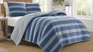 In a sea of ocean hues, Nautica Saltmarsh quilt set is offering a timeless look that is perfect for year round use. Large scale striping sweeps the top of quilt predominately in ocean hues combining with cool neutrals. With the quilt intended to be fully reversible, the reverse offers a cool neutral printed textured background for a versatile look. The rounded corner sham provides a soft sensibility that features the reverse print into the bound edges. For easy removal, sham has a 2-pc. back closure. You are "covered" literally with this 100% cotton set including a quilt and 1 sham that is both lightweight and constructed to last long. With our cotton/polyester blend fill, this set is easy to maintain plus machine washable! prewashed for a super soft feel. A 1 inch by 2 inch horizontal channel stitch enhances loftiness of the quilt and ensures filling to not shift in between washes. Sustainably crafted, the eco-friendly packaging is a way to help reduce plastic waste. This set is securely bundled with a four way ribbon.
