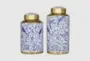 The perfect compact storage for your belongings while keeping your surface space protected. Give your surface space a finishing touch with these beautifully crafted decorative jars. Modern blue and gold jars create an elegant display and storage in any room in your home, and perfect as housewarming gifts. This item ships in 1 carton. Please note that this item is for decorative purposes only and is not food safe. Stoneware decorative jars makes a great gift for any occasion. Suitable for indoor use only. This item ships fully assembled in one piece. This blue colored decorative containers comes as a set of 2. Modern style. Vases have a 3.50 in, and 3.50 in mouth openings.