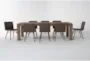 The Bonham 79-98" Natural Wood Metal Rectangular Extendable Dining Set for 8 is perfect for your dining room or kitchen. This industrial-style set features a natural color that complements various interior designs. The solid acacia wood, veneer, faux leather, and metal materials ensure durability and comfort for your dining experience.