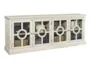 Introducing the Abilene 86" Traditional TV Stand with Doors, a stunning addition to your living room. Crafted from select hardwoods with oak veneer, this piece features a beautiful alabaster finish that complements its traditional design. With adjustable shelves and cord management, it is perfect for keeping your media accessories organized.