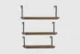 Organize and decorate with these floating wall shelves that would add style and function to your industrial-themed home space. This item ships in 1 carton. Can be hung horizontally using the keyholes on the back; nails and screws not included. Suitable for indoor use only. This item ships fully assembled in one piece. Maximum weight limit is 20 lbs. This brown colored floating shelf comes as a set of 3. Wood wall shelf features 3 shelves. Industrial style.