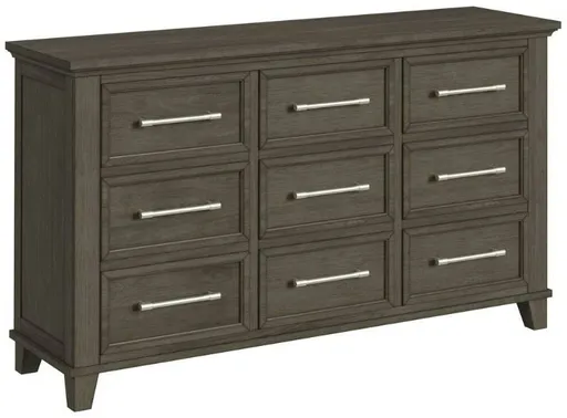 It offers a timeless design with a classic gray finish. Featuring nine spacious drawers, it provides ample storage for clothing and accessories. The dresser's elegant molding details and sturdy construction make it a stylish and functional bedroom addition.