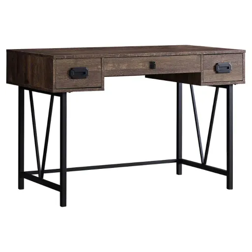 With an industrial and rustic charm, this 48 inch computer desk from RC Willey features a highly functional contemporary design that will look great in your home office. This desk comes with plenty of storage including two side drawers with retro style metal pulls, and a wide middle drawer with a leather pull. The spacious tabletop constructed from high quality MDF material with a smooth laminate in a brown reclaimed wood-look finish can easily hold your computer and other office essentials. Accented with strong black metal legs in a unique design, this stylish office desk will be a standout whether you place it in a corner of your living room, family room, or home office space.